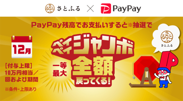 「飲食店で当たる!ペイペイジャンボ」「毎月どこかで当たる!ペイペイジャンボ12月」「さとふるで当たる!ペイペイジャンボ」が開催中