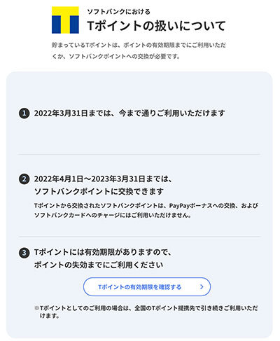 「Yahoo!ズバトク」でのTポイント付与、「Yahoo!ネット募金」でのTポイント利用を除き、ヤフーでもTポイントの利用・付与を終了する。また、クレジットカードのソフトバンクカードのTポイントサービスも終了し、22年4月1日以降はPayPayボーナスを付与する。