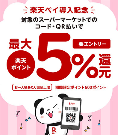 楽天ペイは「【楽天ペイ導入記念】対象のスーパーマーケット限定!最大5%還元キャンペーン(12月度)」を12月1日から開催している。キャンペーンによる還元は3.5%で、楽天ペイのコード・QR払いでいつでも最大1.5%還元が加わり、最大5%が還元される。還元上限は500ポイント。