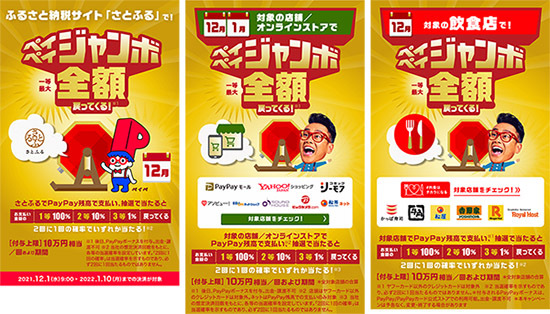 PayPayは12月に複数の抽選で購入金額の最大100%が戻ってくる「ペイペイジャンボ」を実施している。「さとふるで当たる!ペイペイジャンボ」「飲食店で当たる!ペイペイジャンボ」「毎月どこかで当たる!ペイペイジャンボ12月」の3種類だ。仕組みはどれも同じで、対象店舗あるいはサービスをPayPay残高支払いをするとくじを引くことができる。