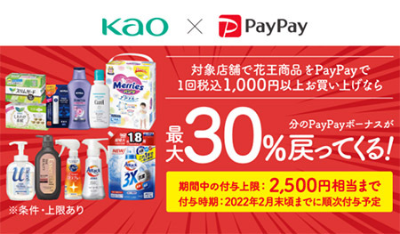高還元率でチェックしておきたいのが、最大30%還元の「花王商品の購入で最大30%戻ってくるキャンペーン」。今回が第4弾となる人気企画で、対象店舗で花王商品を1000円以上購入すると30%が戻ってくる。対象店舗は主にドラッグストアで、公式サイトやアプリでチェックして利用するとよいだろう。付与上限は2500円相当。12月31日まで。