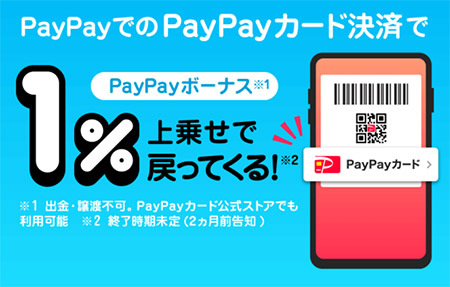 新しく発表されたものでチェックしておきたいのが、「PayPayでのPayPayカード決済で1%上乗せで戻ってくるキャンペーン」。PayPayが展開するクレジットカード「PayPayカード」に関連するキャンペーンで、PayPayの支払い方法に同カードを登録して利用すると、通常の還元分に加えて1%が上乗せされる。上乗せの還元上限は2500円相当/回・月。終了期間は未定となっている。