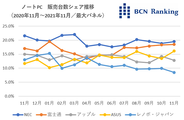 メーカー別でも軒並み前年を下回るなか、上位5社で唯一前年を上回ったのがASUSだ。販売台数は前年同月に比べて125.4%と好調で、メーカー別シェアはNECと富士通に次ぐ3位にランクアップしている。トップ争いでは、夏以降、富士通がじわじわとシェアを上げており、NECとの差を詰めている状況だ。