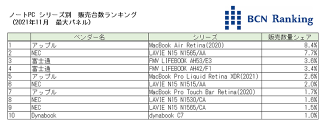 シリーズ別の販売台数シェアランキングでは、アップルの「MacBook Air Retina(2020)」が首位。NECの「LAVIE N15 N1565/AA」が追う展開。注目したいのは各シリーズのCPUで、上位10シリーズのうち、インテル製が3シリーズ、AMD製が4シリーズ、アップル製が3シリーズとなっていることだ。年末商戦ではこちらの裏のシェア争いからも目が離せない。(BCN・大蔵 大輔)