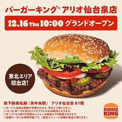 ビーケージャパンホールディングスは、東北エリア初出店となる「バーガーキング アリオ仙台泉店」を12月16日にグランドオープンする。