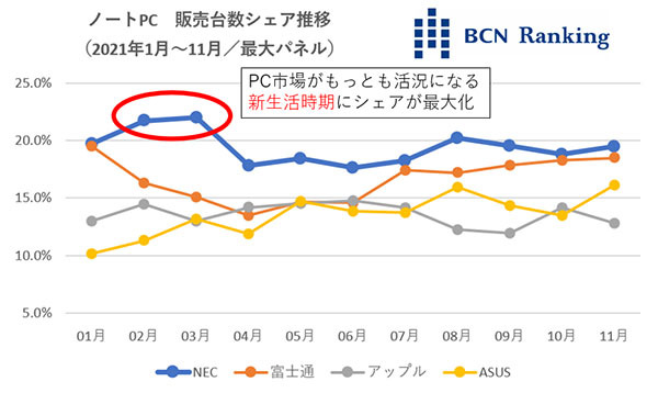 全国の家電量販店やECショップのPOSデータを集計している「BCNランキング」によると、2021年1月~11月のメーカー別ノートPC販売台数シェアでトップを走っているのは、NECパーソナルコンピュータ(以下、NECPC)。年初から1度も首位を譲ることなく、王者の座を不動のものにしている。特に市場が盛り上がる新生活時期の3月は20%を超えるシェアを獲得し、ユーザーからの信頼の高さを示した。