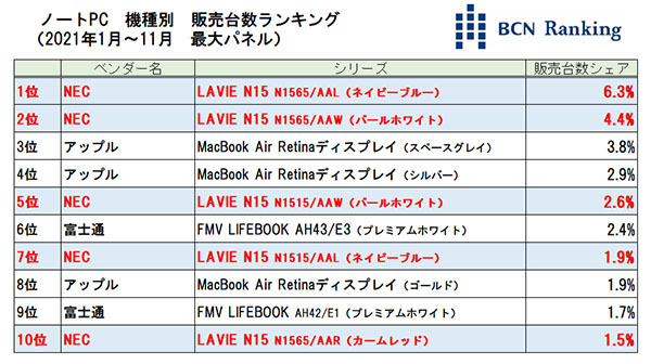 NECPCはノートPC市場において機種別のトップだけでなく、メーカー別の販売台数シェアNo.1も確実視されている。もしNo.1を獲得すればBCNランキングにおいて11年連続でもっともノートPCが売れたメーカーの称号を手にすることになる。また、少し気は早いかもしれないが、現在のトレンドが継続するなら、2022年のノートPC市場は新しいLAVIE N15シリーズがけん引していくことになるだろう。(BCN・大蔵大輔)