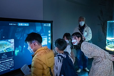 身近な魚ではあるものの、近くでまじまじと見るのは子どもたちにとって新鮮な体験。今回のツアーでは口元が見える透明マスクを付けた説明員が魚の生態をレクチャー。案内を聞きながら、生き生きと動き回る魚たちを熱心に観察した。カワスイでは魚の生態について、タッチ対応のディスプレイやスマートフォンでより詳細に知ることができる。目で見て触って情報を得ることができる仕組みに、子どもたちも好奇心を刺激されたようだった。
