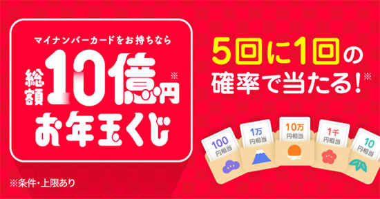 また、12月27日~1月11日の期間で「総額10億円お年玉くじ」も開催する。参加条件はPayPayで本人確認とメールアドレス設定を行うこと。デイリーミッションやワンタイムミッションをこなすことで、くじを引ける回数が決まる。くじは5回に1回の確率で当たり、1等は10万円相当のポイントをゲットできる。なお、12月27日~1月11日はくじを引く権利を獲得できる期間で、実際に引けるのは1月14日~1月21日の期間なので、注意しよう。