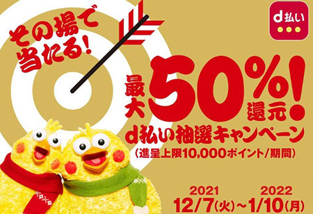 d払いは「その場で当たる!d払い抽選キャンペーン!」。d払い(コード決済)で500円以上の買い物をすると、抽選で5分の1の確率でdポイントを還元する。内訳は1等が50%、2等が25%、3等が0.2%。還元上限は1万ポイント/期間。対象店舗はコンビニからドラッグストア、飲食店など幅広い。ほとんどの店舗で使えるが、一部キャンペーンに不参加の店舗があり、そちらはホームページ上で確認することができる。