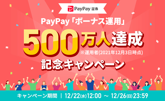 今回の達成を記念して、「ボーナス運用」500万運用達成記念キャンペーンを実施する。12月22~26日までのキャンペーン期間中、PayPay証券のTwitter公式アカウントをフォローし「キャンペーン応募用ツイート」をリツイートした人の中から抽選で毎日100人に500円相当のPayPayボーナスをプレゼントする。