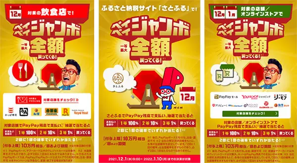 対象の店舗で利用すると最大全額戻ってくるくじが引ける「ペイペイジャンボ」は「飲食店」「さとふる」「オンラインストア」で開催中。飲食店は12月31日、さとふるとオンラインストアは1月10日までとなっている。公式サイトやアプリなどで、対象店舗を確認して、うまく利用するとよいだろう。