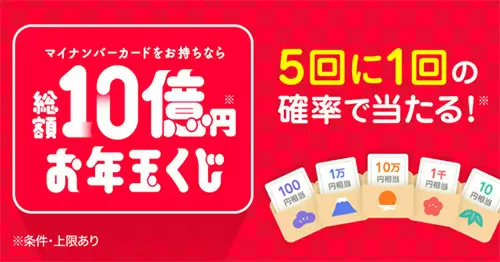 12月27日~1月11日の期間で注目したいのが「総額10億円お年玉くじ」だ。参加条件はPayPayで本人確認とメールアドレス設定を行うこと。デイリーミッションやワンタイムミッションをこなすことで、くじを引ける回数が決まる。くじは5回に1回の確率で当たり、1等は10万円相当のポイントをゲットできる。12月27日~1月11日はくじを引く権利を獲得できる期間で、実際に引けるのは1月14日~1月21日という点に注意。買い物をする必要がないという珍しいキャンペーンなので、ぜひ参加してみてほしい。