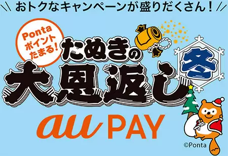 最大20%還元が売りだったau PAYの「たぬきの大恩返し 冬」は12月25日で終了。au PAY支払いの対象店舗で「初めて同サービスを利用する、もしくは9月~11月の利用がないユーザー」は最大20%還元、それ以外のユーザーは最大10%還元になるというお得なものなので、最終日にかけこむのもありだ。還元上限は1au IDあたり500ポイント/回、2000ポイント/期間(コード支払いとネット支払いでそれぞれ1000ポイント)。