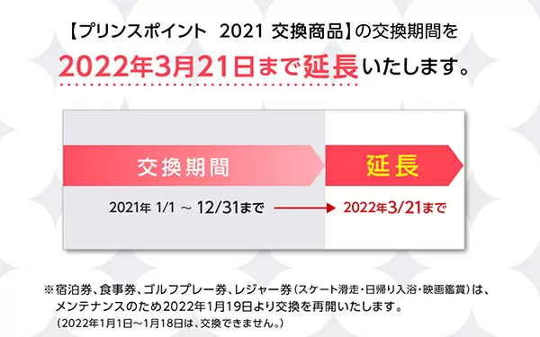 このポイント利用サービスの開始に伴い、たまったプリンスポイントで交換可能な「ポイント交換商品」の21年度分の交換期間を22年3月21日まで延長するとともに、交換商品のラインアップを22年度から縮小する。