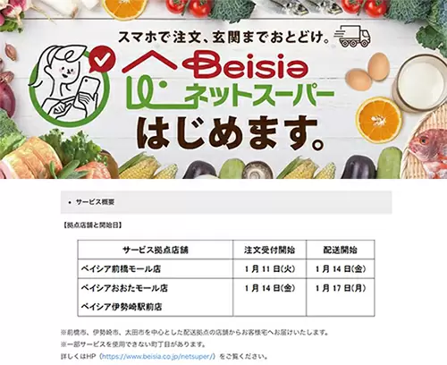 ベイシアは、楽天グループの提供するネットスーパー運営プラットフォーム「楽天全国スーパー」内に、「ベイシアネットスーパー」をオープンする。まずは前橋モール店(1月14日配送開始)、おおたモール店・伊勢崎駅前店(1月17日配送開始)の3店舗で導入し、群馬県外にも随時エリアを拡大していく予定。