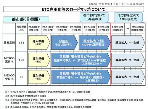 ETC利用率は、21年9月実績で96.7%と高く、ETC専用料金所を拡大することで、料金所のキャッシュレス化・タッチレス化の一層の推進を図る。ETC専用化のロードマップによると、25年度までに料金所全体の約9割・約160カ所に拡大し、30年に全てETC専用とする。