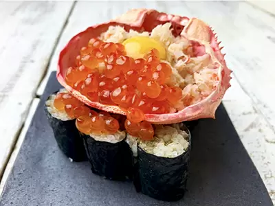 エビカニ合戦は、毎日必ず売り切れとなる目玉商品。蟹の甲羅に海老・蟹・いくら、うずらの卵をよく混ぜて、柚子胡椒の細巻きにかけて味わう名物料理となっている。