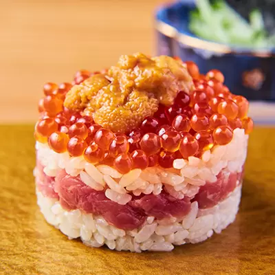 人気映え商品「極みユッケと雲丹いくらミルフィーユ」