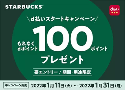 スターバックス コーヒージャパンがNTTドコモのスマートフォン(スマホ)決済サービス「d払い」の導入を記念して1月11日から開催してきた「d払いスタートキャンペーン」が、1月31日に終了する。スターバックスのキャンペーン対象店舗で400円以上の買い物を「d払い」で決済した全員に、dポイントを100ポイント分プレゼントするというもの。