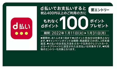 エントリーしたら、1会計あたり400円以上の買い物を「d払い」アプリで支払うと、もれなくdポイント(期間・用途限定)が100ポイント進呈される。