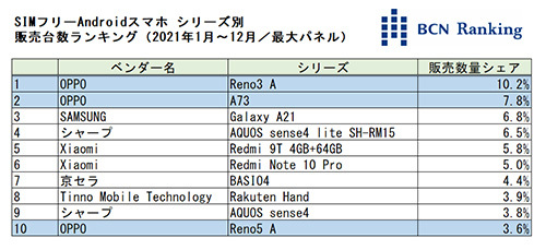 同社のトップシェアに大きく貢献したのは「OPPO Reno3 A」だ。2020年6月の発売以来、幅広い販路で売上を伸ばし、2021年にもっとも売れたSIMフリーAndroidスマホに輝いた。2位には「OPPO A73」がランクイン、さらに直近では2021年6月に発売された「OPPO Reno5 A」(年間ランキングでは10位)が好調で、ラインアップの盤石さがうかがえる。