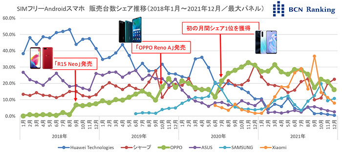 2021年のSIMフリーAndroidスマートフォン市場でもっとも売れたメーカーはOPPO