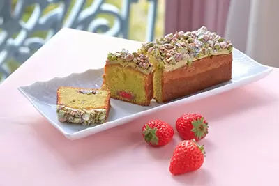 「パウンドケーキ ピスタチオ」は、生のピスタチオペーストを練り込んだしっとりとした風味豊かな生地に、粗く砕いた柔らかさの残る生のピスタチオを加えて食感のアクセントにしている。生地の表面にローストしたピスタチオペーストを加えて豊かなコクとほのかな甘みのバタークリームで覆い、噛み応えのある糖衣掛けのピスタチオでザクザクとした香ばしさをトッピングしている。