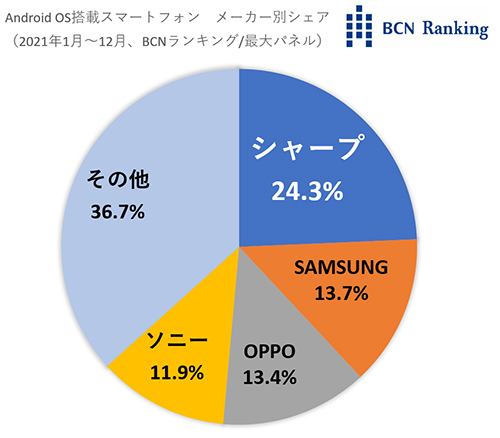 全国の家電量販店やネットショップのPOSデータを集計する「BCNランキング」によると、2021年(1月~12月)のAndroid OS(ベースOS)搭載スマートフォンで最も売れたメーカーはシャープだった。今回で5年連続となる。21年の年間シェアは24.3%で、2位とは約2倍の差。圧倒的な支持の背景には何があるのか。ユーザーが購入を決断する現場、家電量販店の売り場で話を聞いてきた。