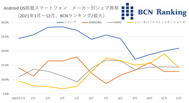 21年のAndroidスマホの月別シェアは、常にシャープがトップを走っていた。サムスンは5月と10月、OPPOは7月と8月にシェアを伸ばしたほか、4位のソニーは11月に20%に届きそうなほど急伸長したが、シャープは9月と10月を除き20%以上のシェアを保ち好調に推移した。人気を支えているのは、エントリーからミドルレンジをカバーする「AQUOS sense」シリーズだ。