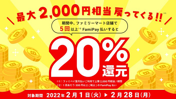 ファミペイが2月1日から開催しているのが「最大2,000円相当戻ってくるキャンペーン」。期間中にファミマで5回以上のファミペイ払いをすると20%を還元する。通常の還元上限は500円相当だが、ファミペイ翌月払いをすると2000円相当までアップする。なお、1回あたりの支払い金額は300円以上でなければならないので注意してほしい。期間は2月28日まで。