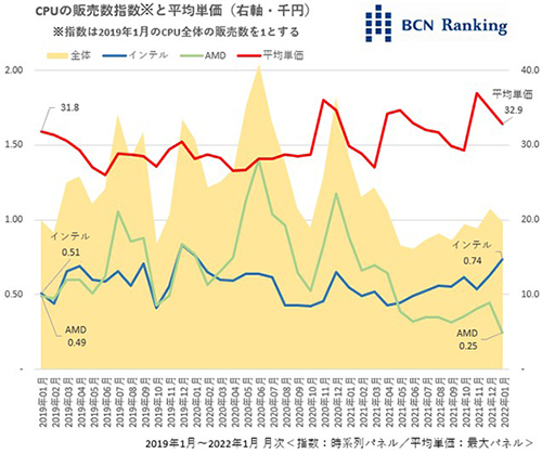 この1月の販売指数は0.98とやや持ち直したものの、3年前の水準に戻しただけで、世界的な需要の高まりに追いついていない。税抜き平均単価はジリ上げ基調。19年1月の3万1800円から、直近では3万2900円に上昇した。見かけ上はあまり単価上昇がみられないが、実際は主力のCPUのグレードが下がっている影響もあり、価格上昇が抑えられているというのが現状だ。