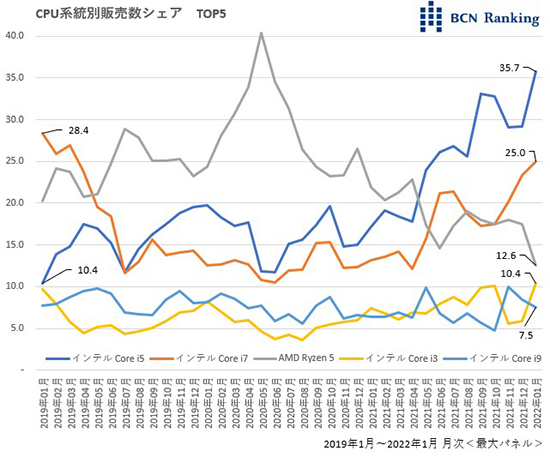 AMD躍進の原動力は、Ryzen 5シリーズだ。同社の売り上げがピークだった20年6月は、Ryzen 5シリーズの販売数シェアが40.4%を記録しダントツの売り上げを誇った。その後シェアの下落が続き、この1月では12.6%まで売り上げを落としている。変わってシェアを拡大したのがインテルのCore i5シリーズ。この3年の間15%前後のシェアで推移していたが、昨年夏以降売り上げを伸ばし直近では35.7%と大きなシェアを獲得している。一方上位モデルのCore i7シリーズは、3年前はシェア28.4%と売り上げトップだったものの、一時15%を下回るまでシェアを落とした。直近では25.0%まで回復しているが主力はi5シリーズだ。