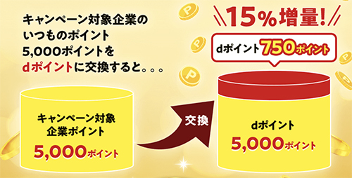 キャンペーンページでエントリーの上、期間中にキャンペーン対象企業の公式サイト・アプリなどから対象企業のポイント(他社ポイント)をdポイントに交換すると、dポイント(期間・用途限定)で、交換が完了したポイントの15%相当のキャンペーンポイントをプレゼントする。なお、基準となる他社ポイントからdポイントへの交換レートはキャンペーン対象企業ごとに異なる。キャンペーンポイントの進呈時期は22年5月末頃。