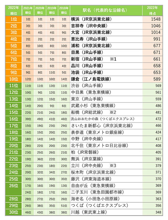 栄えある第1位に輝いたのは「横浜」。2018年から5年連続でトップを獲得した。2位は2018年以降で初の2位となる「吉祥寺」、3位は初のトップスリー入りを果たした「大宮」。異なる都道府県がそれぞれ上位を分け合った。