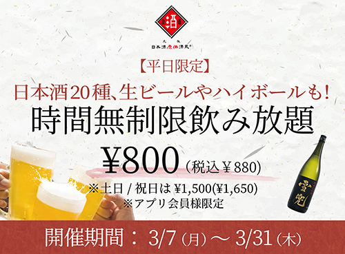 クリエイティブプレイスが運営する日本酒原価酒蔵は、全店舗で3月7日から3月31日の期間、時間無制限飲み放題を開催する。