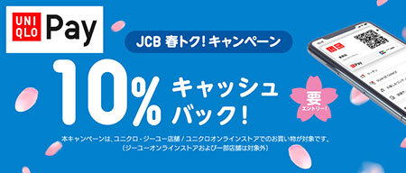 ユニクロのキャッシュレス決済サービス「UNIQLO Pay」も3月15日までとなるが、お得なキャンペーンを開催している。それが「JCB 春トク!キャンペーン~UNIQLO PayにJCBカードを登録して利用すると10%キャッシュバック!最大1,000円相当~」だ。