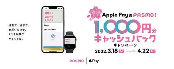 PASMO協議会とパスモは、Apple PayのPASMO限定で、「新生活にApple PayのPASMO!1,000円分キャッシュバックキャンペーン」を3月18日10時~4月22日23時59分に実施する。