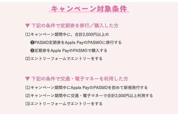 エントリーのうえ、「期間中に初めて発行したApple PayのPASMOで交通・買い物に合計2000円以上利用する」「期間中に合計2000円以上の定期券をApple PayのPASMOで購入する」「期間中に合計2000円以上のPASMO定期券をApple PayのPASMOに移行する」のいずれかを満たす人に対し、手持ちのPASMOに電子マネー1000円分をプレゼントする。
