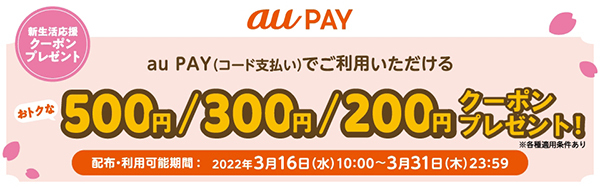 au PAYは最大10%還元の「たぬきの大恩返し 春」が3月15日に終了。次のお得なキャンペーンとしてスタートしたのが“クーポン”だ。3月16日に開始した「新生活応援キャンペーン」では、九つの対象店舗で使える割引クーポンを配布している。