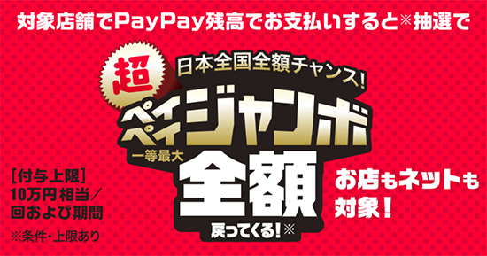 PayPayの3月のキャンペーンは非常に対象店舗が多い。2月1日から実施されている「日本全国全額チャンス!超ペイペイジャンボ」は、リアル・オンラインでPayPayを導入しているほとんどの店舗が対象。決済するとくじを引くことができ、抽選で最大全額(1等で決済金額の100%、2等で5%、3等で0.5%)が還元される。還元上限は10万円/回・期間。