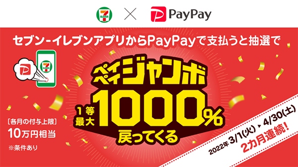 また、セブン-イレブンでは別で「セブン-イレブンアプリで当たる!ペイペイジャンボ」が開催されている。セブン-イレブンアプリを経由してPayPay支払いをすると、抽選でくじが当たるキャンペーンで、1等で1000%、2等で10%、3等で1%が戻ってくる。還元上限は10万円相当/月。くじが当たる確率は2回に1回と高いのも魅力的だ。期間は4月30日まで。