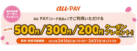 au PAYは新生活応援企画としてお得なクーポンを配布している。取得・利用できるのは3月31日までなので、早めにゲットして使い切りたいところだ。対象になっているのは、いなげや、サミット、JA-SS、マツモトキヨシ・ココカラファイン、ららぽーと、ダイソー、ほっかほっか亭、デイリーヤマザキ、ドトールコーヒーグループ。割引額は200円・300円・500円で、店舗ごとに条件が異なっている。また、同じ期間で「セブン‐イレブン」も200円値引クーポンを配布中。税込500円以上の買い物で使うことができる。いずれも先着。