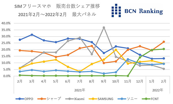 メーカー別の販売台数シェアで、1月にトップに急上昇したFCNTから首位の座を奪取したのがシャープ。FCNTは急落することなく、2位にとどまっている。一方、3番手以降は10ポイント以内でOPPO・ソニー・サムスン・Xiaomiが競り合う展開。2021年とは異なる市場模様になっている。