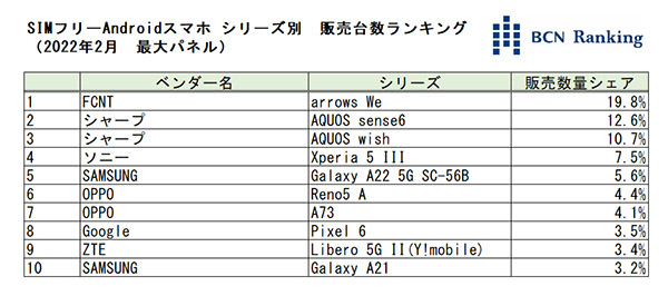 シリーズ別の販売台数ランキングではFCNTの「arrows We」がトップで、19.8%という高シェアを記録した。それに続くのはシャープの「AQUOS sense6」「AQUOS wish」。高価格ながらソニーの「Xperia 5 III」が4位にランクインしていることにも注目したい。(BCN・大蔵 大輔)