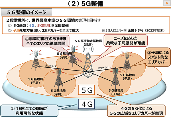 5Gについては、まず、全ての居住地で4Gを利用可能な状態(23年度末までに4Gエリア外人口0人)を実現し、その上で5Gエリアの拡大を加速させる。具体的な施策は、「新たな5G用周波数の割当て(2.3GHz帯の新規割当てを含む)」「基地局開設の責務を創設する電波法の改正」「補助金、税制措置による支援」「インフラシェアリング推進」となる。