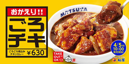 松屋フーズは、同社が展開する牛めし・カレー・定食・その他丼の「松屋」において、4月5日午前10時より「ごろごろ煮込みチキンカレー」を発売する。