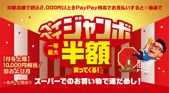 4月のPayPayはスーパーもお得だ。「2,000円以上のお買物で最大半額当たる!スーパーマーケットジャンボ」は、対象のスーパーマーケットで税込2000円以上の買い物をPayPay残高支払いですると、くじを引くことができるキャンペーン。1等は決済金額の50%、2等で3%、3等で1%。還元上限は1万円相当/回・月。6月30日まで。