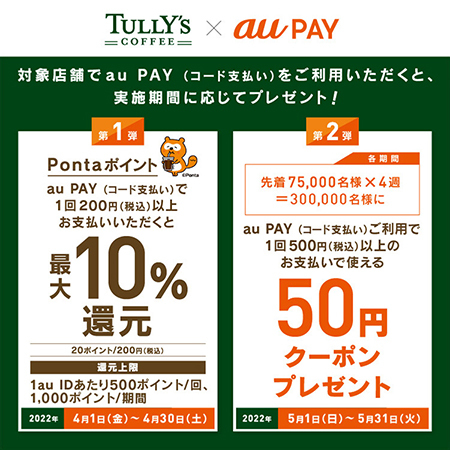 au PAYは4月1日にタリーズコーヒーで最大10%還元するキャンペーンを開始した。税込200円以上をau PAYで支払うと最大10%を還元する。還元上限は1au IDあたり500ポイント/回、1000ポイント/期間。期間は4月30日まで。
