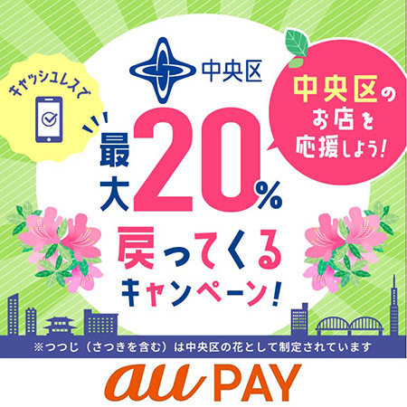キャンペーンの対象となるのは、東京都中央区・大阪府池田市・京都府京田辺市。それぞれの地域でau PAY決済を利用すると決済金額の最大20%を還元する。